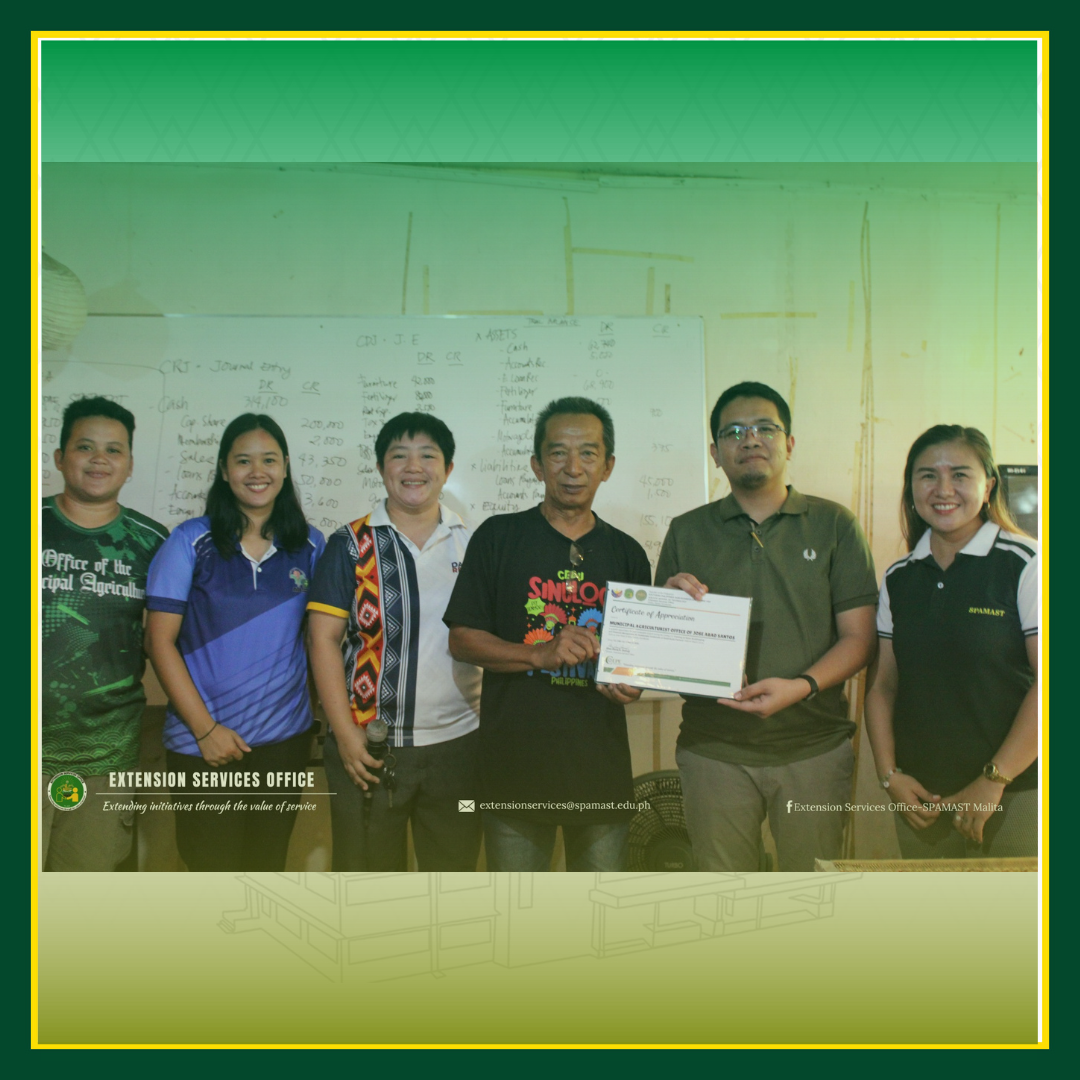 A two-day Training on Basic Bookkeeping and Financial Management for Small-Scale Farmers was successfully conducted on March 13–14, 2025, at Jose Abad Santos, Davao Occidental. This initiative was a collaboration of Extension Services Office of SPAMAST, SPAMAST JAS Campus, led by Mrs. Ana Fe Canasta, and Municipal Agriculturist Office, headed by Ronville M. Muego. The continue reading : Empowering Farmers: ESO Hosts Bookkeeping Training in Jose Abad Santos