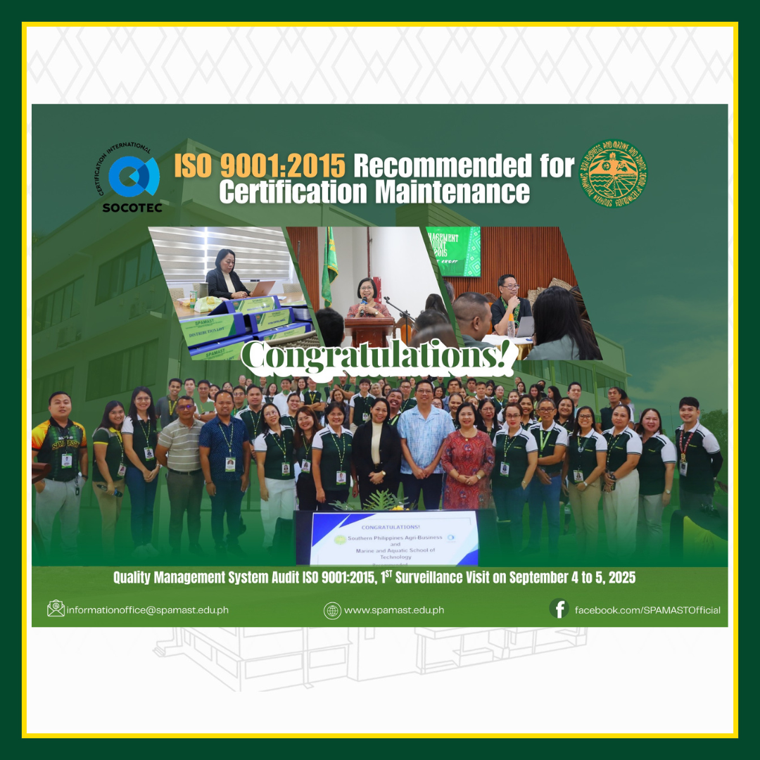 Reaffirming its standing as a center of academic excellence in the region, the Southern Philippines Agri-Business and Marine and Aquatic School of Technology (SPAMAST) has been strongly recommended for the maintenance of its ISO 9001:2015 certification by SOCOTEC Certification Philippines, Inc. on September 5, 2025. The audit was led by Dr. Catherine Talao-Sigua and Mr. continue reading : SPAMAST Secures Strong Recommendation for ISO 9001:2015 Certification Maintenance