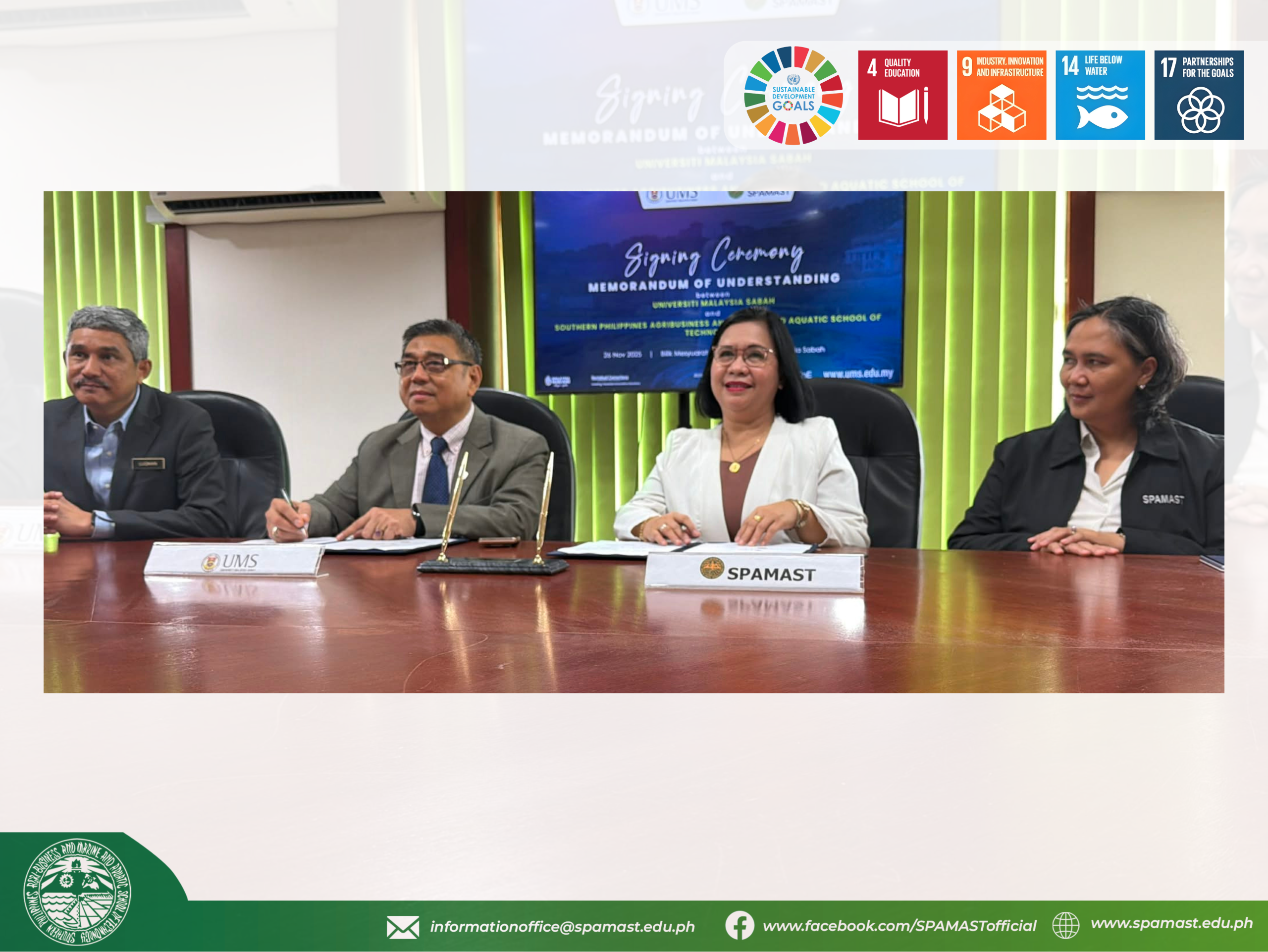 The Southern Philippines Agri-Business and Marine and Aquatic School of Technology (SPAMAST) entered into a landmark partnership with Universiti Malaysia Sabah (UMS) through a formal Memorandum of Understanding (MOU) signed on November 26, 2025. The collaboration reinforces both institutionsโ thrust toward advancing international academic cooperation, research development, and capacity building aligned with global sustainable development continue reading : SPAMAST and Universiti Malaysia Sabah Seal International Partnership Through MOU Signing