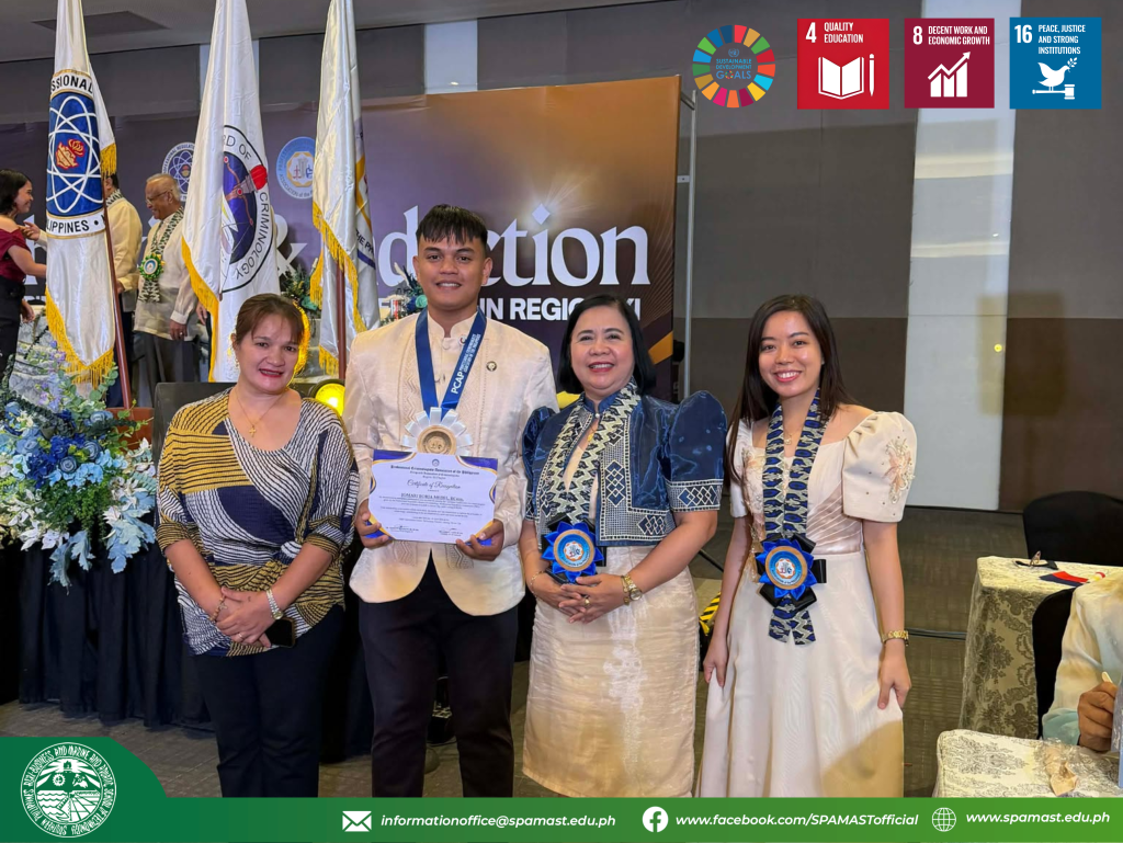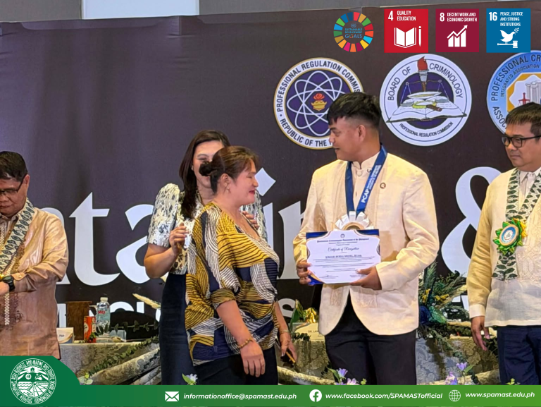 The Professional Regulation Commission (PRC) conferred upon SPAMAST a prestigious award for ranking among the Top 8 performing schools in the Philippines, achieving an impressive 94.12% passing rate. The ceremony also recognized the institution’s top-performing graduates, including Mhijlhon Montenid Abana, RCrim, who garnered a rating of 89.2%, and Jomari Borja Medel, RCrim, who achieved a notable 91.3%. Their accomplishments reflect the institution’s sustained commitment to academic rigor, quality instruction, and values-driven education, positioning its graduates to contribute meaningfully to law enforcement and public safety.
