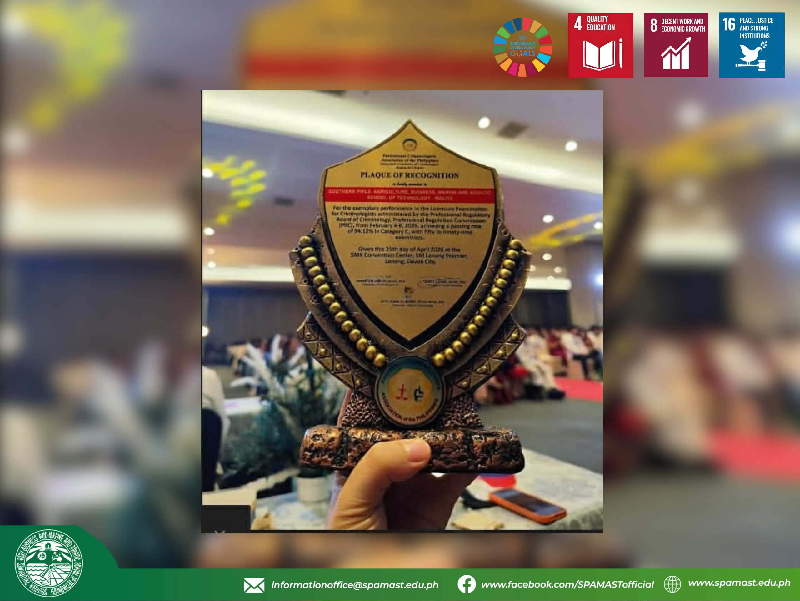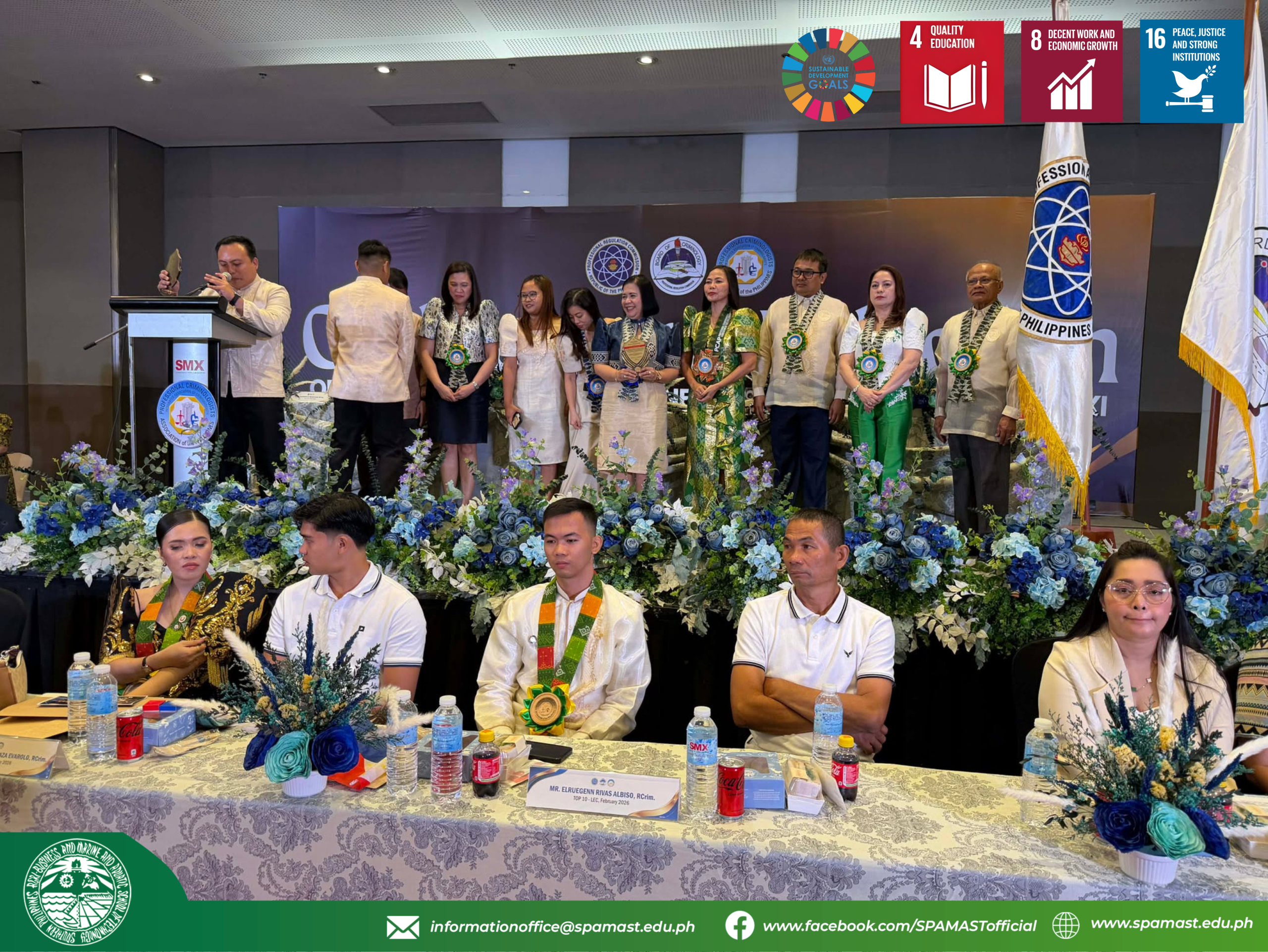 DAVAO CITY — Newly licensed criminologists and incoming members of the Philippine College of Criminology Alumni (PCAP) formally took their oath during a regional induction ceremony held on April 25, 2026, at the SMX Convention Center, SM Lanang Premier. The event highlighted academic excellence and professional commitment, with the Southern Philippines Agri-Business and Marine and Aquatic School of Technology (SPAMAST) emerging as one of the top-performing institutions nationwide. Representing the institution, Dr. Lynette A. Bontia, the SPAMAST President, received the Plaque of Recognition alongside Dr. Jonel Mark Sarno, Dean of the Institute of Human Service, in acknowledgment of SPAMAST’s outstanding performance in the recent Criminologist Licensure Examination.