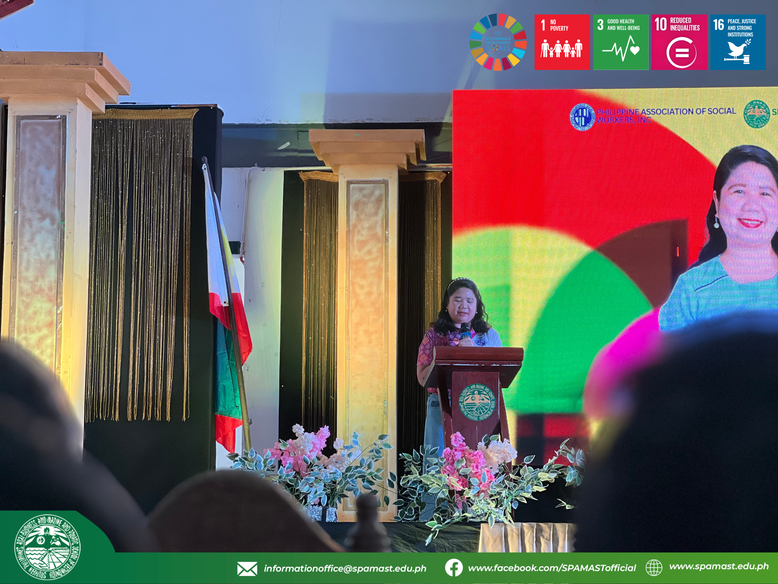 The program opened with ceremonial preliminaries, followed by welcome remarks from Prof. Karla C. Aspacio, MS, who emphasized the responsibility of emerging social workers in nation-building. Messages of support were delivered by SPAMAST SUC President Dr. Lynette A. Bontia, PASWI Davao Occidental Vice President Arlene V. Getalla, and Institute of Human Services Dean Dr. Jonel Mark D. Sarno, each affirming the profession’s commitment to responsive and people-centered service. The keynote address by Atty. Romelyn Barrios-Magallanes, MSWDO Head of Sta. Maria, further highlighted the need for strengthened partnerships across sectors to address evolving social challenges.