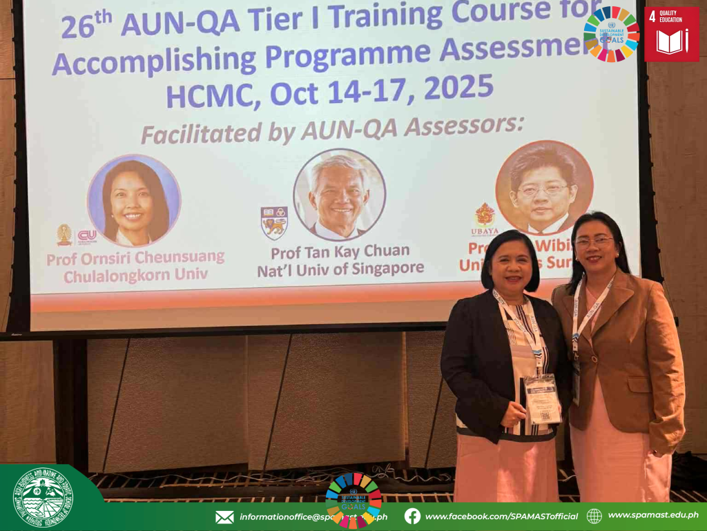 The Southern Philippines Agri-Business and Marine and Aquatic School of Technology (SPAMAST) continues to uphold its commitment to international quality standards as its College President, Dr. Lynette A. Bontia, and Quality Assurance Director, Dr. Jovelyn L. Franca, participated in the 26th ASEAN University Network–Quality Assurance (AUN-QA) Training Course for Accomplishing Programme Assessment, Version 4.0, held from October 14 to 17, 2025, in Ho Chi Minh City, Vietnam.